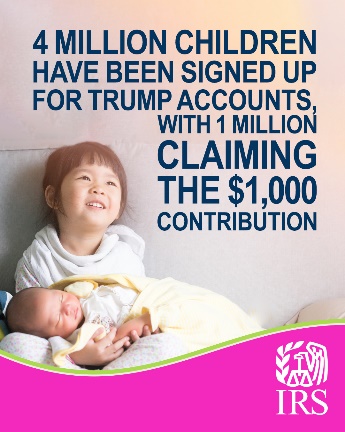 More than 4 million children have been signed up for tax-favored Trump Accounts, with a million children covered by elections for the $1,000 Trump Accounts pilot program contribution. For more information from the #IRS, visit: https://ow.ly/RSF050YBMpU